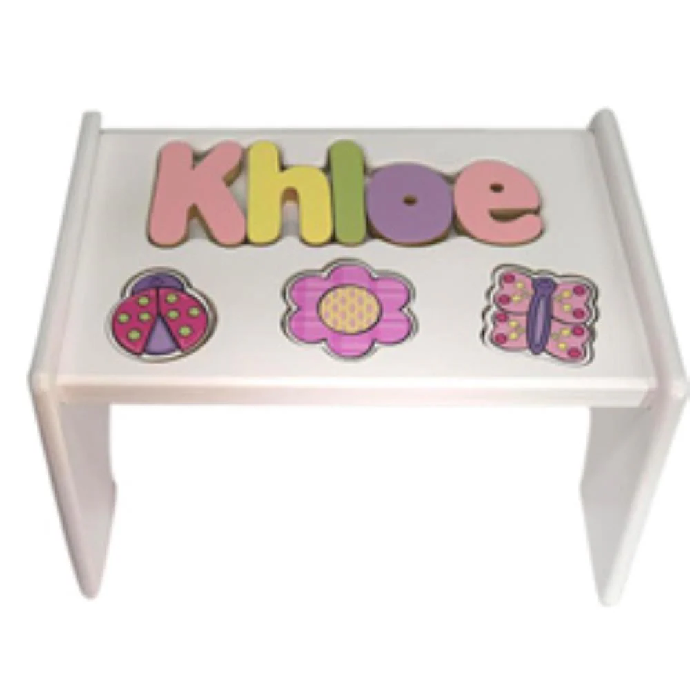 This adorable step stool is a great gift idea for your child. Sturdy, useful and super fun for kids to play with over and over again. The puzzled letters of their name and cute garden themed symbols create an excitement for letter recognition and hand eye coordination. Choose the finish and letter color you like, and we'll create a wonderful item your child will love. "