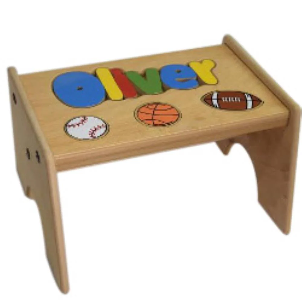 This adorable step stool is a great gift idea for your child. Sturdy, useful and super fun for kids to play with over and over again. The puzzled letters of their name and fun sports themed symbols create an excitement for letter recognition and hand eye coordination. Choose the finish and letter color you like, and we'll create a wonderful item your child will love.