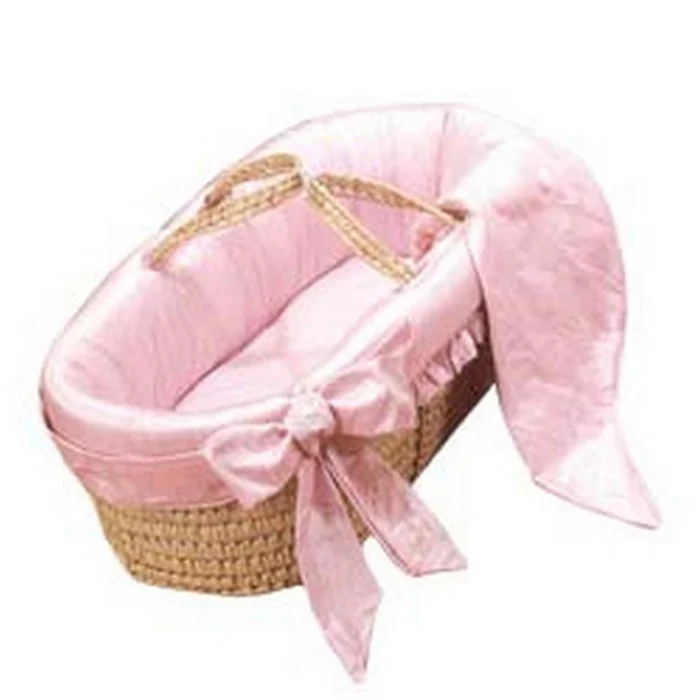 Sophisticated, with satin fabrics and a large bow, this moses basket is a true masterpiece. Made of soft flexible wicker, outfitted with silk bedding, and tipped with a lavish bow, this moses basket provides an elegant and cozy haven for your infant. Convenient handles allow for ultimate mobility.